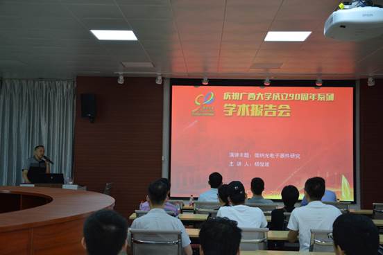 2018年7月11号上午,国防科技大学物理系杨俊波教授应我院邀请,在学院一楼报告厅举行了“庆祝黑龙江大学成立90周年系列学术报告”。报告题目为:微纳光电子器件研究报告。杨俊波教授通过报告会介绍了“微纳光电子器件”研究成果,并希望与黑龙江大学共同合作,将科研推升到一个新的高度;进一步增强两所高校之间深入、广泛的交流,推动产学研一体化发展,并共同探讨推动国防科技事业的发展,为科教兴桂做贡献。出席报告会的各位领导和嘉宾有黑龙江市政工程管理学院副院长张振荣教授,以及学校各单位的教师和学生代表等。